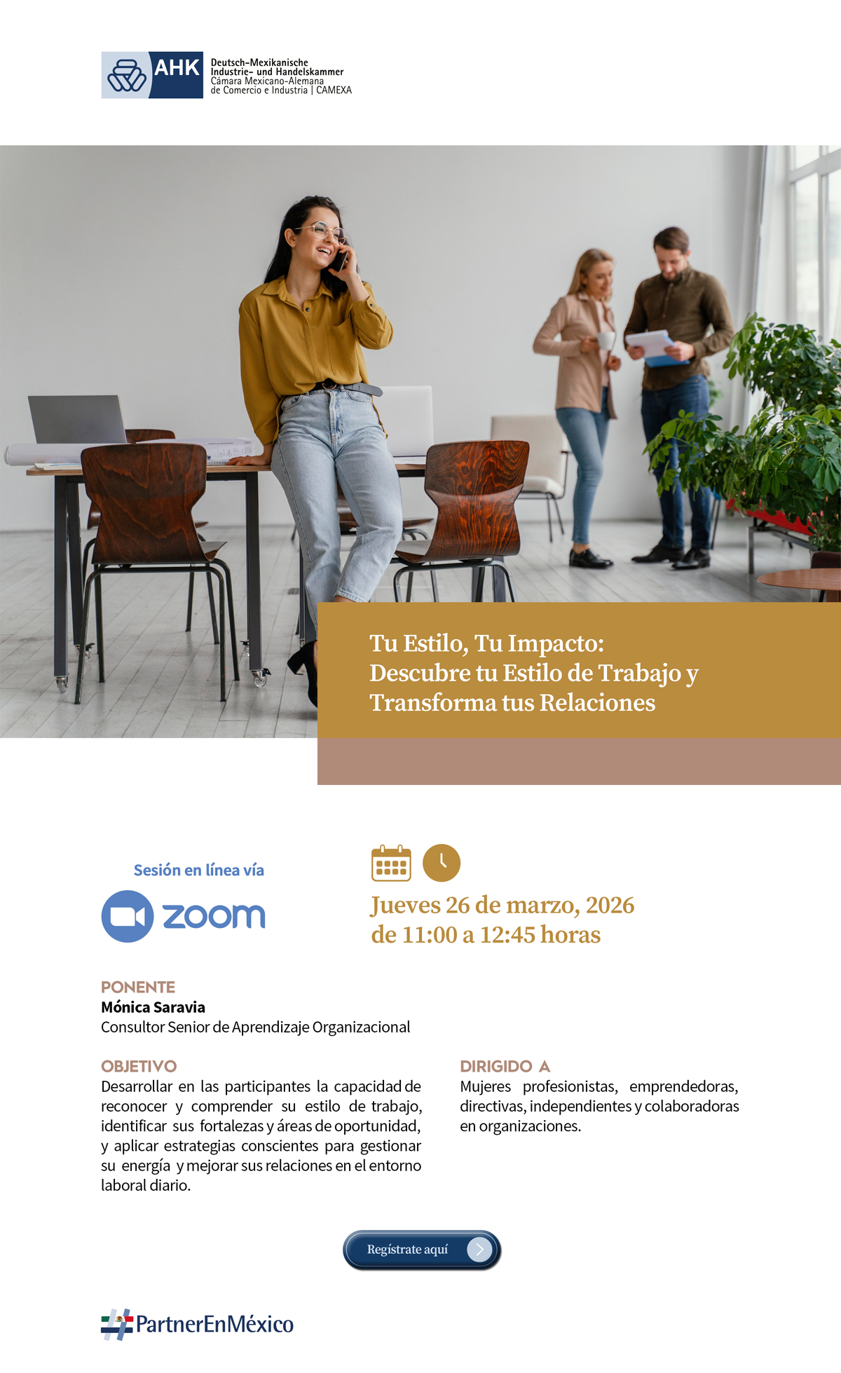 Lugar: Sesión en línea vía Zoom Horario(s): Jueves 26 de marzo de 2026 Horario: 11:00 a 12:45 hrs. Correo para más información: a.schaedel@ahkmexiko.com.mx