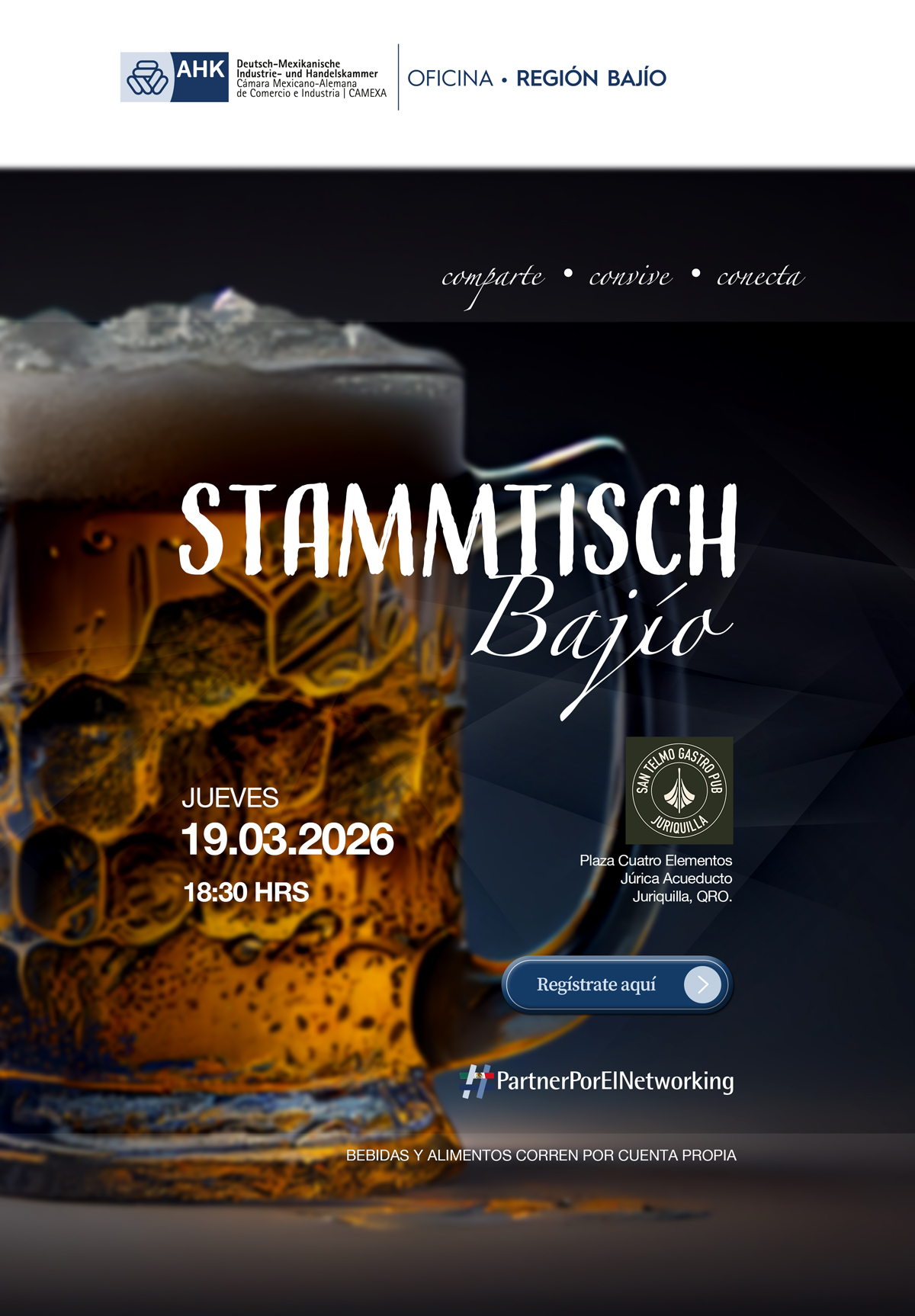 Lugar: San Telmo Juriquilla Plaza Cuatro Elementos, Jurica Acueducto, 76226 Juriquilla, Qro. Horario(s): Jueves 19 de marzo 2026 Inicio: 18:30 hrs - 21:30 hrs Para más información: Nahomy Huacuz asistente.camexabajio@ahkmexiko.com.mx